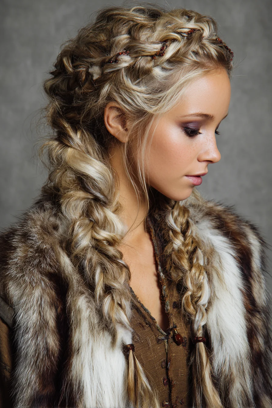 This look suits long hair best and works particularly well on medium to thick textures; fine hair can achieve the same fullness with light clip-in extensions, and loose waves or relaxed curls hold the style more easily than completely straight strands. Start by applying a sea-salt spray or volumizing mousse to damp hair and rough-dry for grip. Create a deep side part and Dutch-braid the front hair into a crown, pancaking the sections as you go to build volume. Gather the remaining hair to the side and transition the crown into a loose fishtail, tugging each weave to create that soft, chunky effect. Tools: tail comb, sectioning clips, small clear elastics, bobby pins, and a 1–1.25