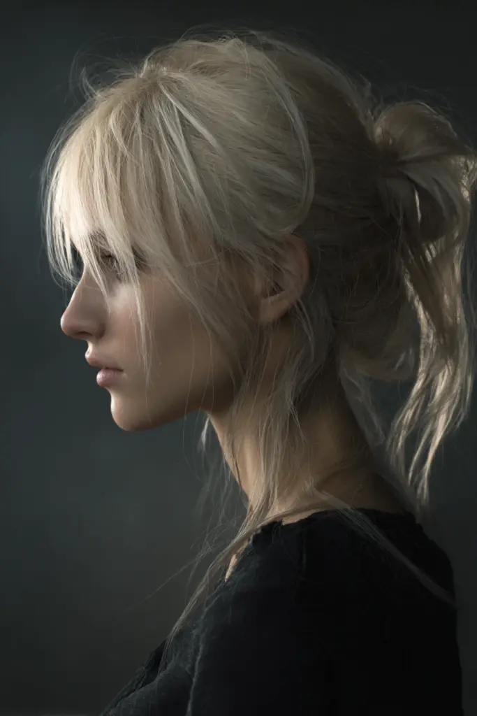 Effortless Textured Top Knot with Face-Framing Bangs – Chic Pinterest Hair Trend