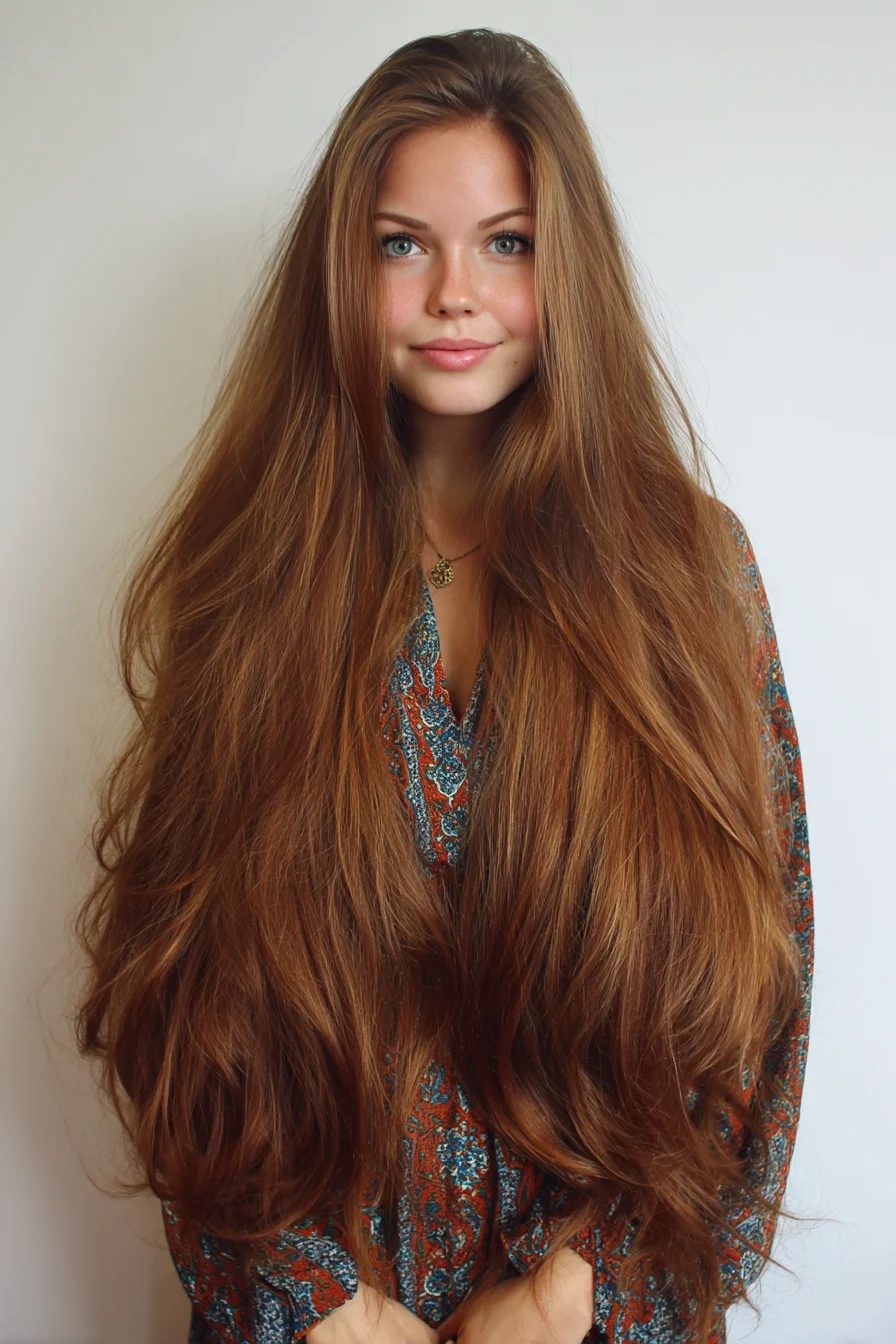 This gorgeous, extra-long wavy hairstyle is a true showstopper and perfectly captures the romantic, bohemian glam trend thats dominating Pinterest boards right now. The hair cascades down in soft, voluminous waves, creating a natural yet luxurious texture. Subtle layering helps to add dimension and movement without sacrificing length, while the rich auburn hue enhances warmth and shine. This look channels vintage-inspired fairy tale vibes—ideal for anyone wanting to make a dreamy style statement at festivals, special occasions, or even as an everyday signature look. Styling tip: Use a large-barrel curling wand for loose waves and finish with a lightweight shine spray for that ethereal glow. Accessories like floral crowns or delicate pins can easily be added for an extra whimsical touch. This hairstyle flatters those with thick hair who want to showcase their natural volume and length; it suits oval, heart-shaped, or long faces especially well. Whether youre inspired by Renaissance aesthetics or modern boho chic trends on Pinterest, this effortlessly elegant look is sure to turn heads.