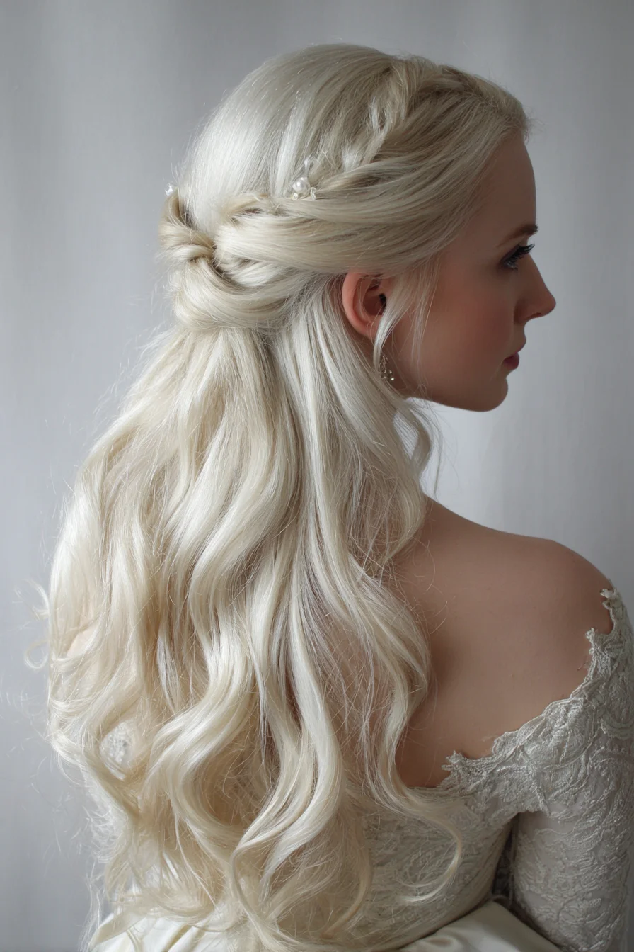 This romantic half-up hairstyle features soft, cascading waves combined with a delicate braid crown, making it a standout choice for weddings, proms, and other elegant occasions. The look starts with voluminous, loose curls that are gently gathered at the back and secured in a twisted knot, while subtle braids frame the face and blend seamlessly into the flowing locks. Tiny pearl accents add an ethereal touch, perfectly aligning with current Pinterest trends for whimsical and fairy-tale-inspired bridal hair. This style is especially flattering for those with long or medium-length hair and works beautifully on all shades of blonde or lightened hair to highlight the dimension in the waves. It suits oval, heart-shaped, and round faces by elongating the neckline and enhancing natural features. Pair this hairstyle with off-the-shoulder gowns or vintage lace dresses to maximize its dreamy effect—ideal for anyone seeking a timeless yet modern look that’s trending across Pinterest boards in 2024.